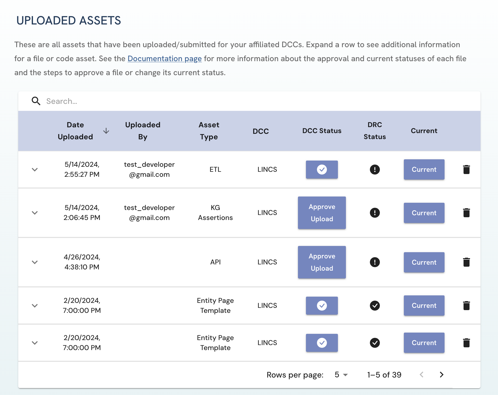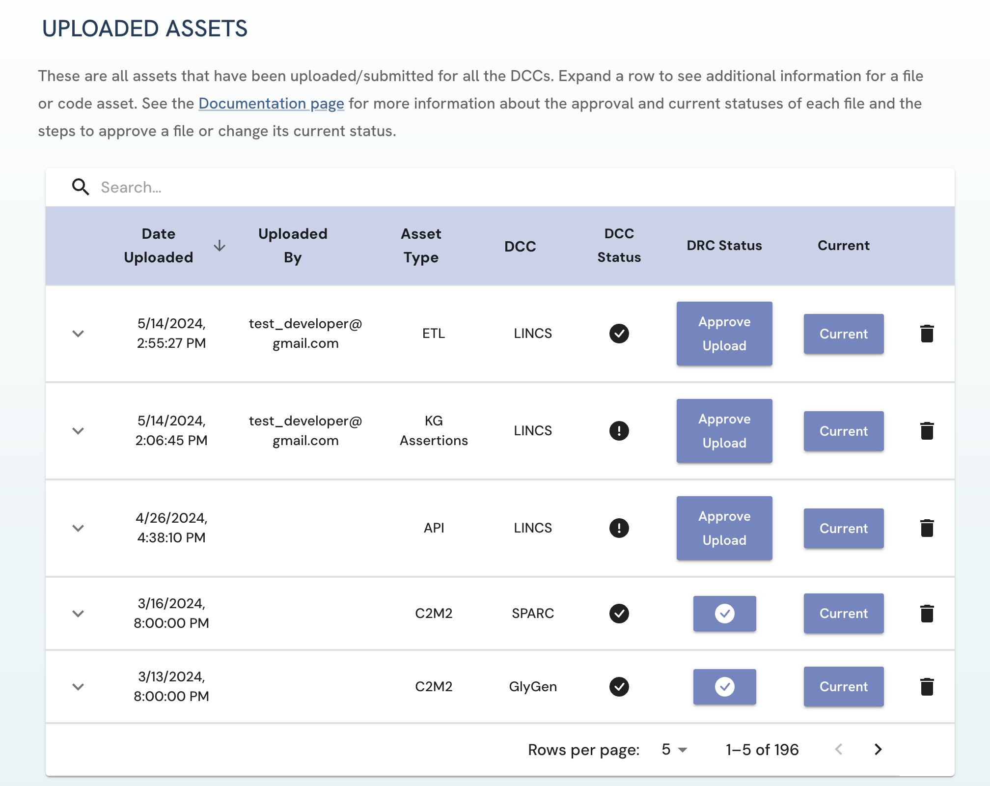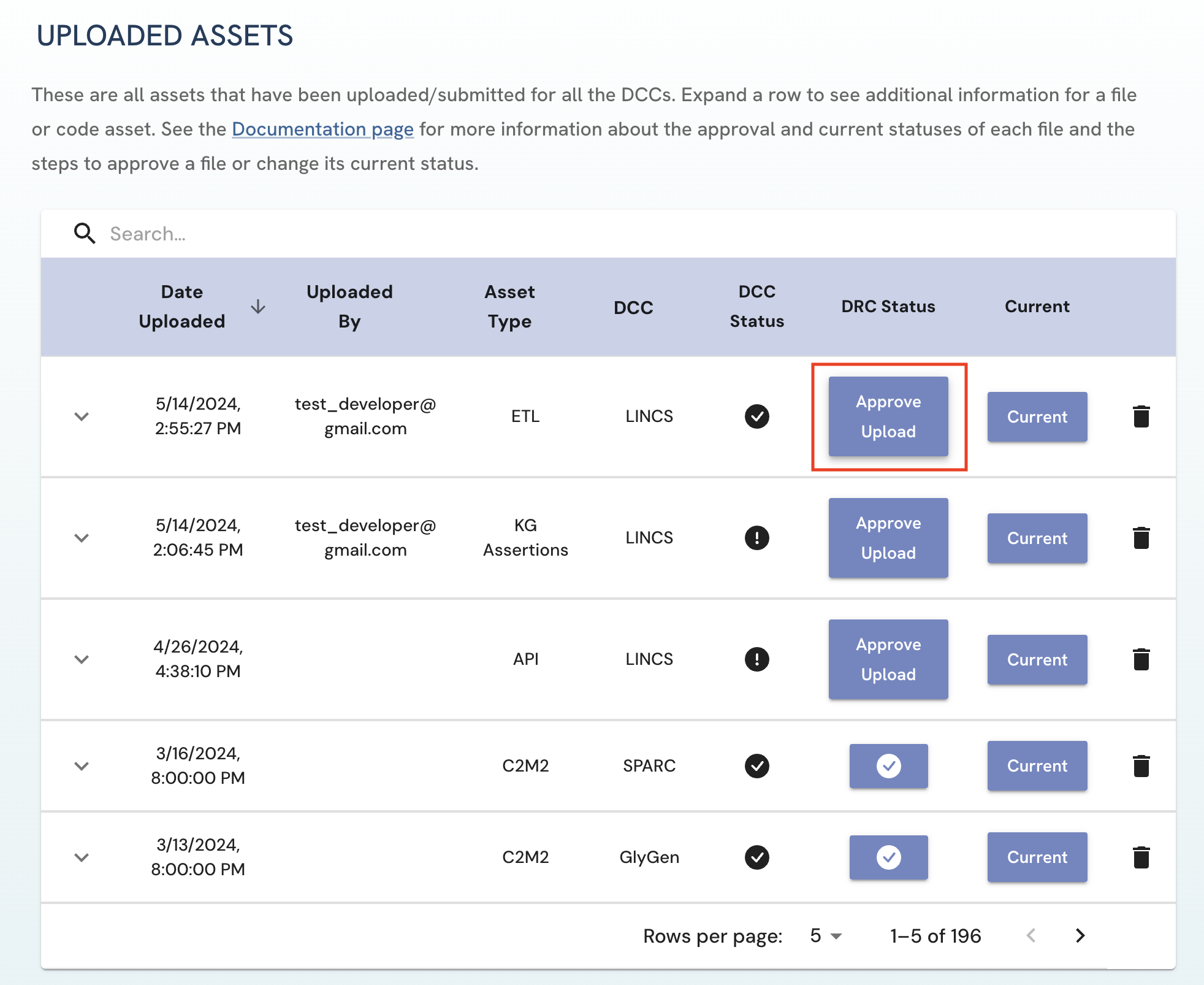 Figure 3: A screenshot of Uploaded Assets page in the view of a LINCS DCC Approver.