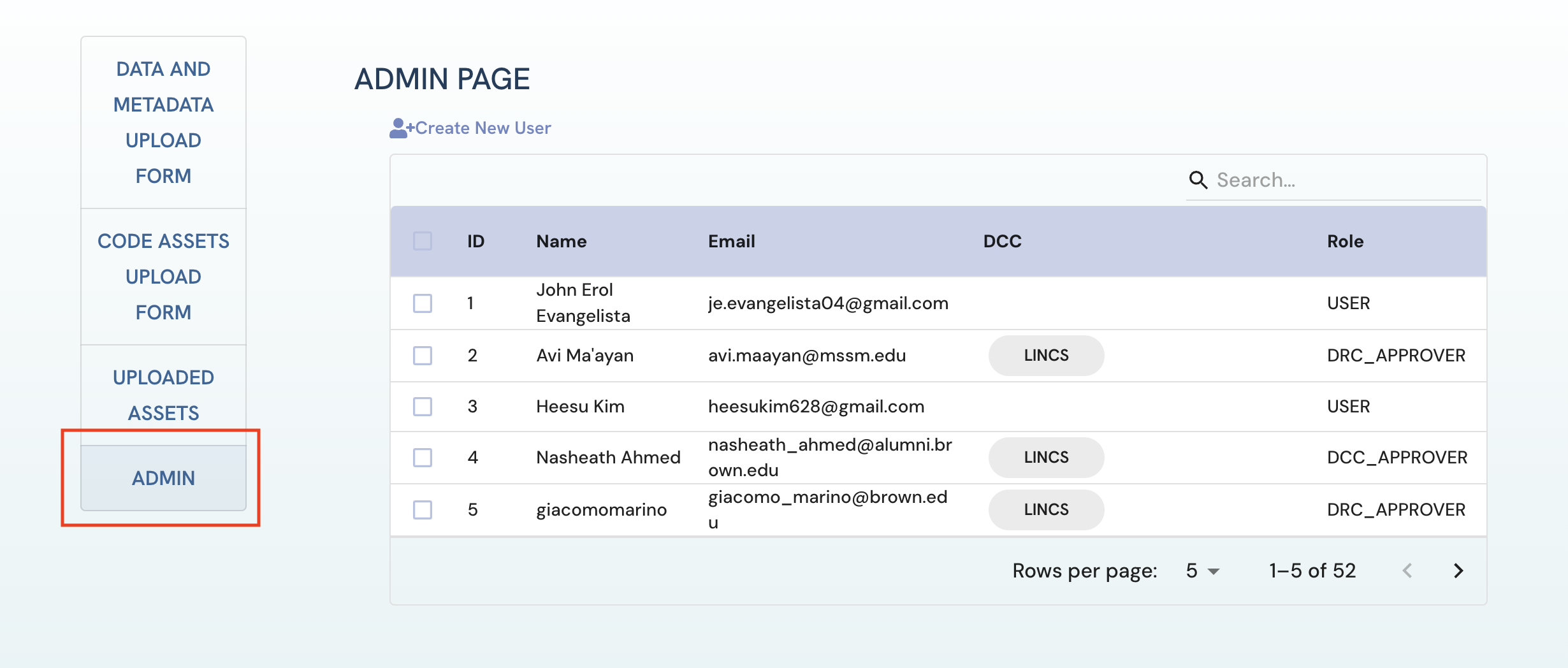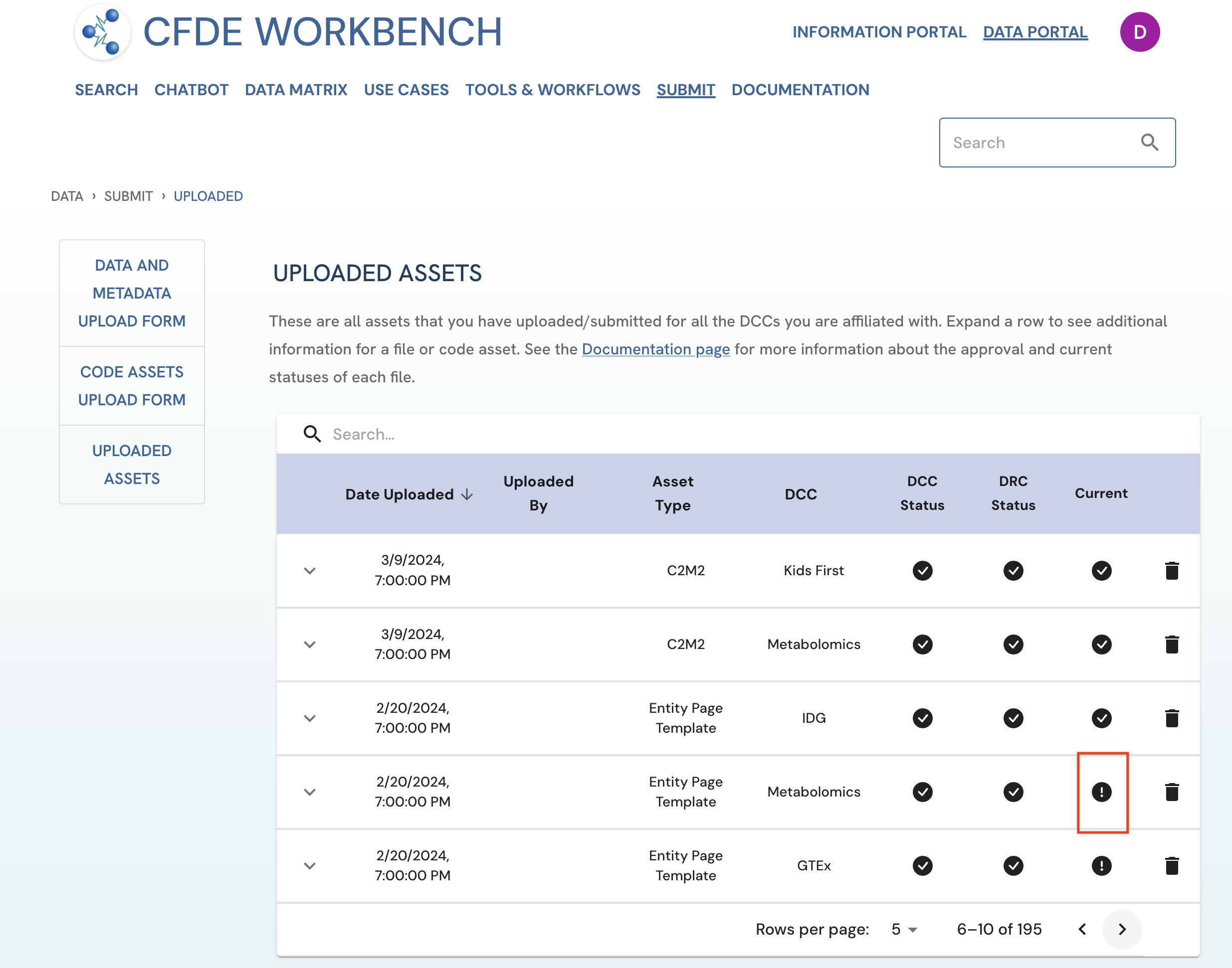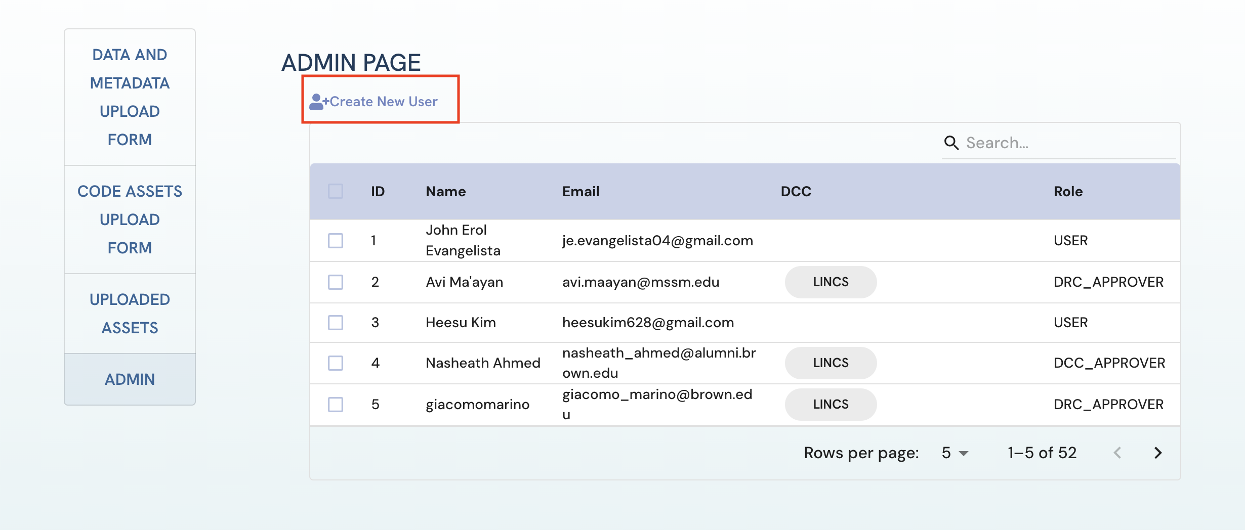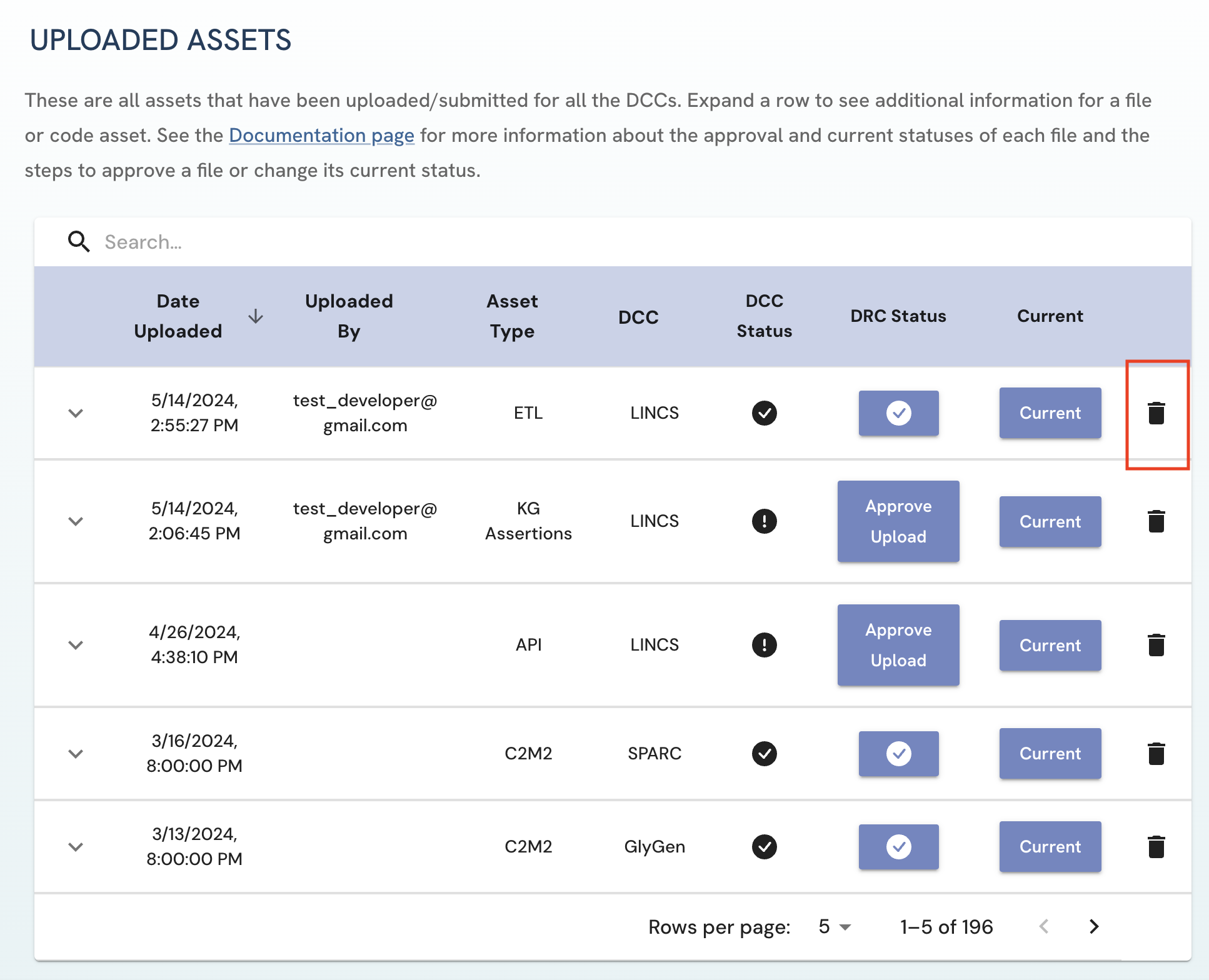Figure 3: A screenshot of Uploaded Assets page in the view of a LINCS DCC Approver.