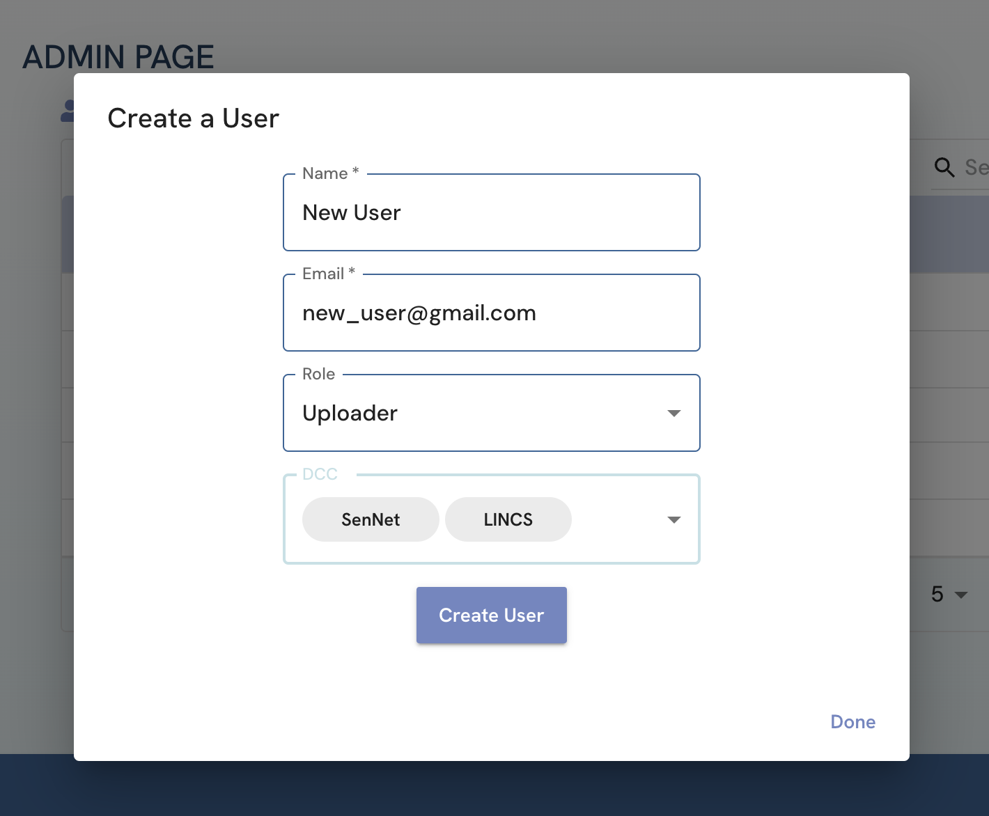 Figure 2: A screenshot of Admin page showing creation of user.
