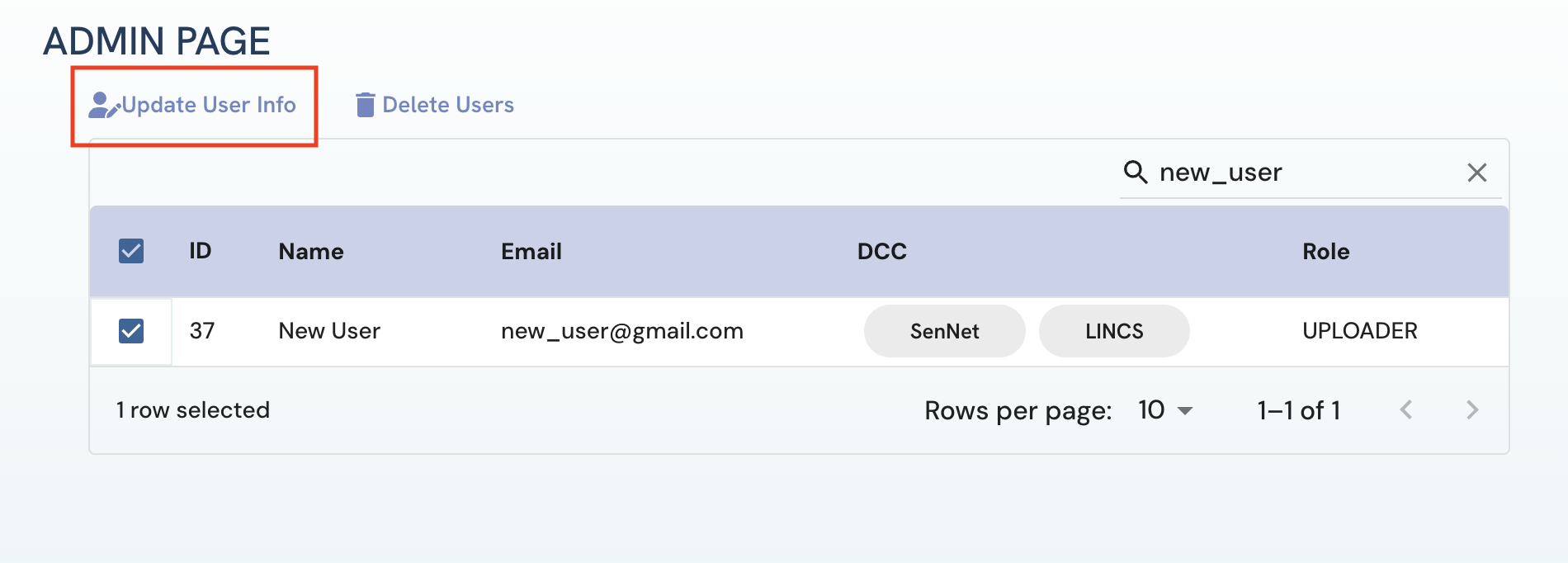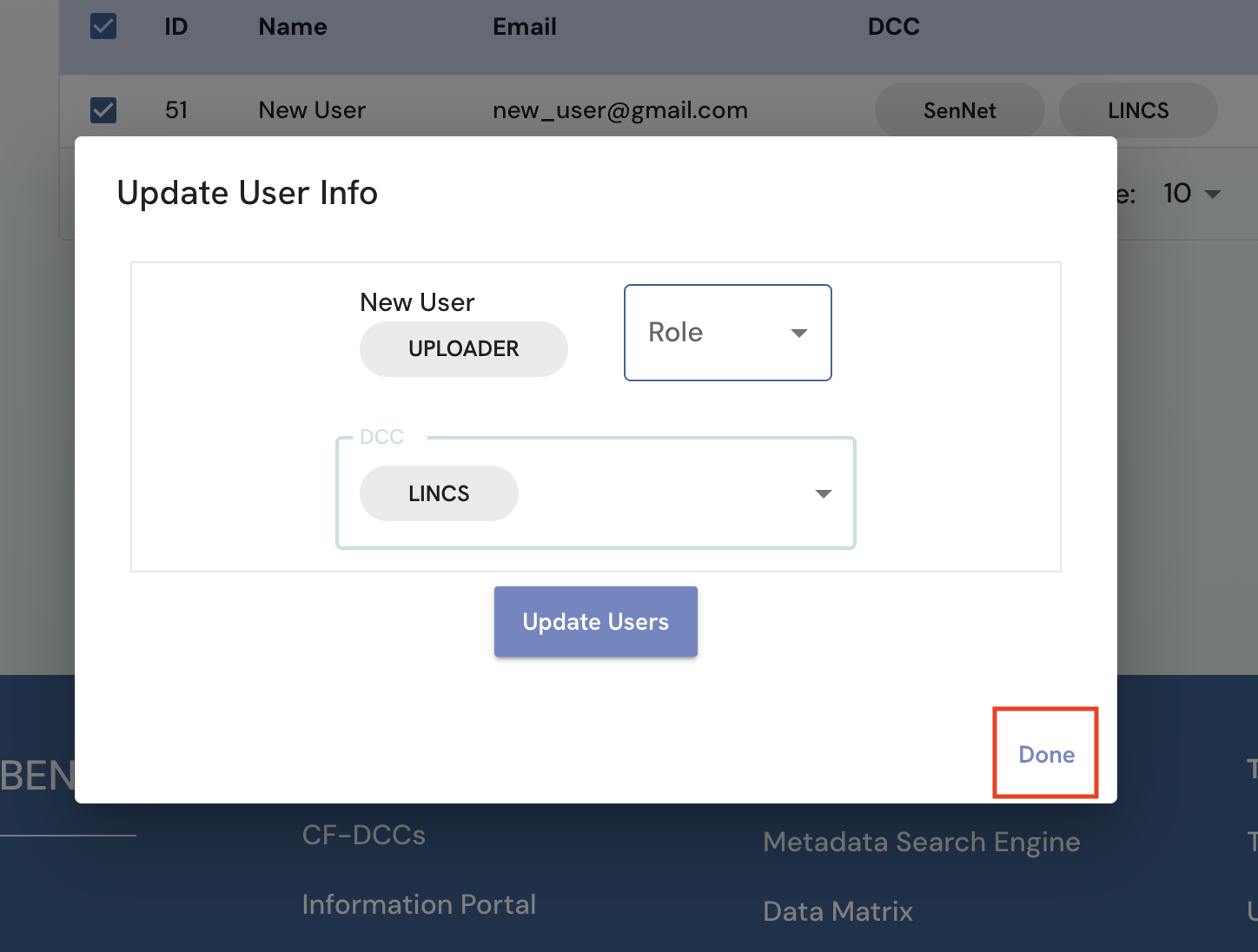 In the dialog box that appears, for each user, select their new role and DCC information and click “Update”. An alert with “User Information Updated” will appear if the update operation is successful.