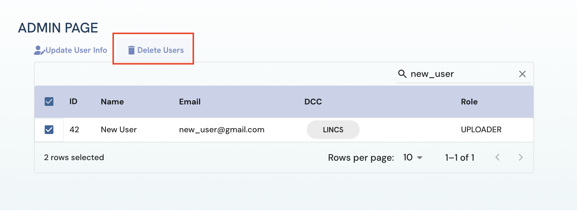 Figure 7: A screenshot of Admin page showing deletion of selected user.