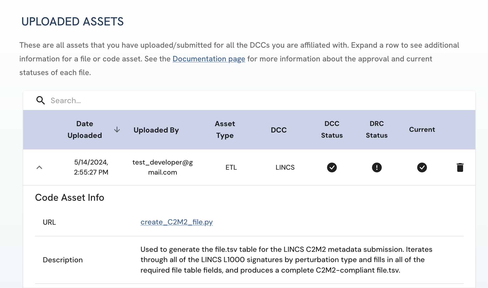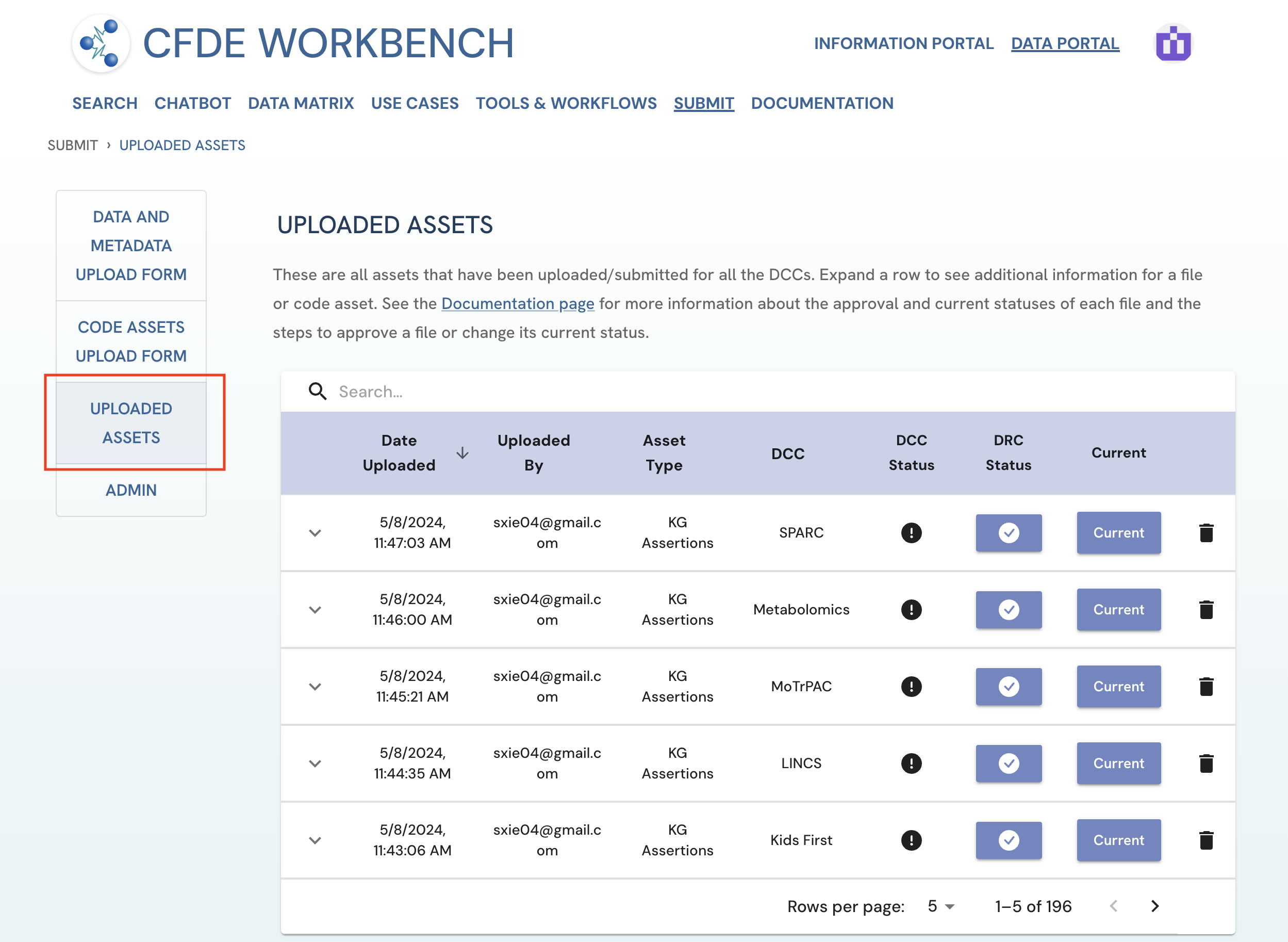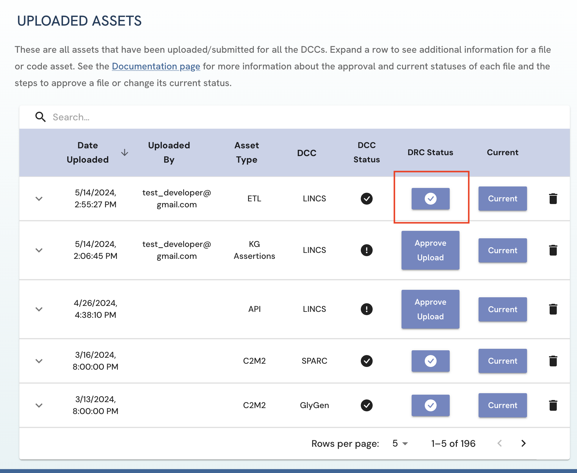 Figure 3: A screenshot of Uploaded Assets page showing a submitted asset with both DCC approval and DRC approval. View of Uploader User