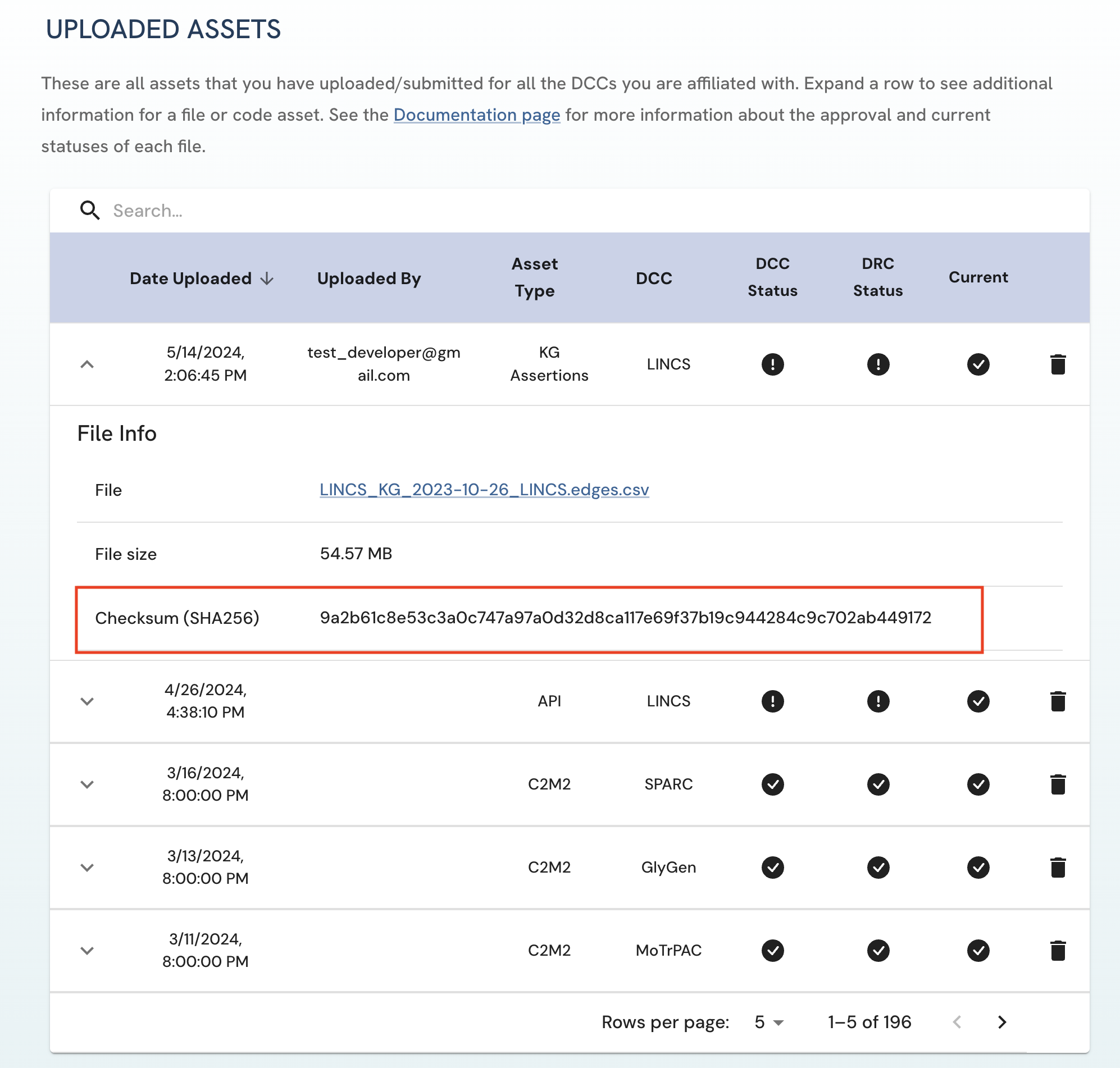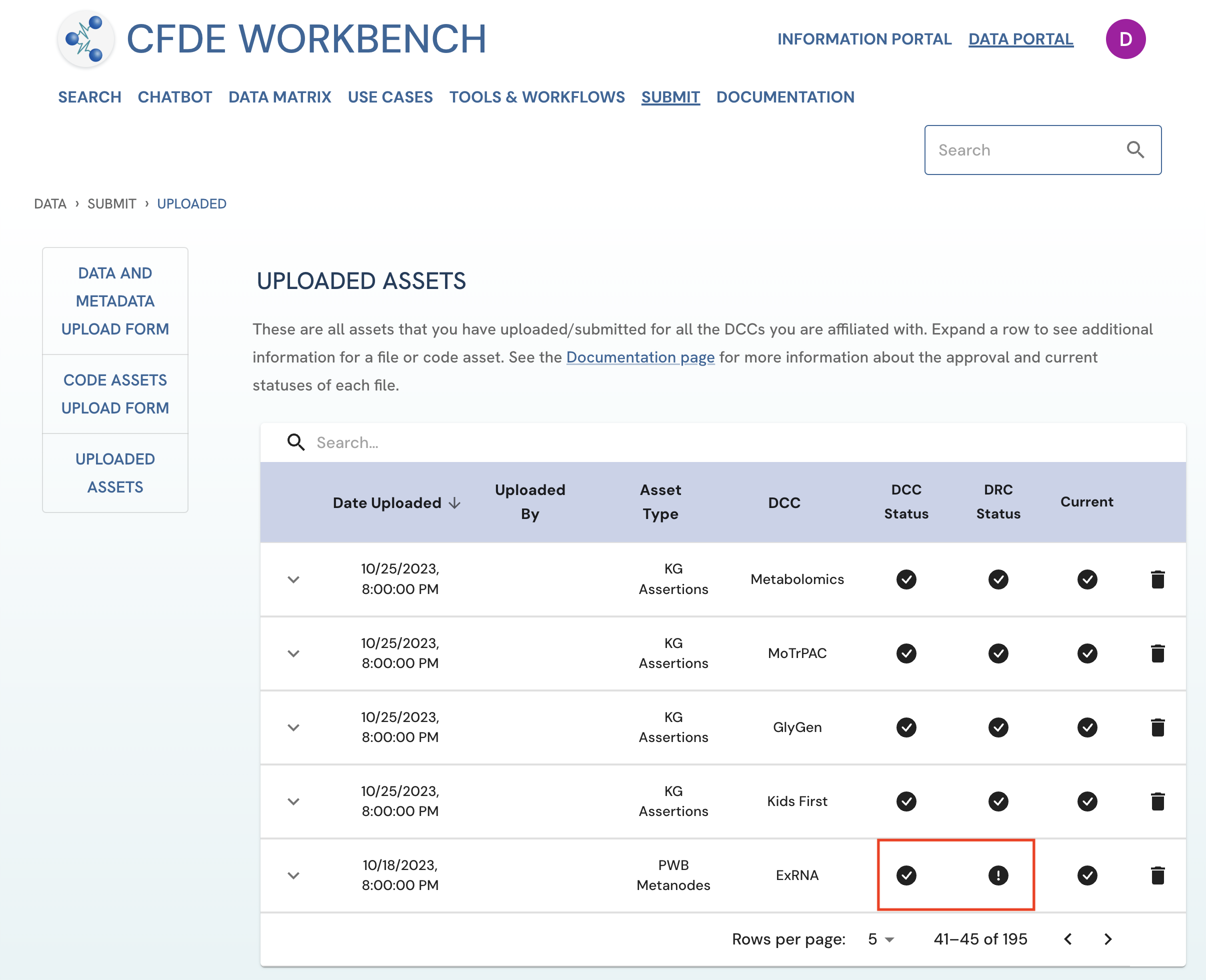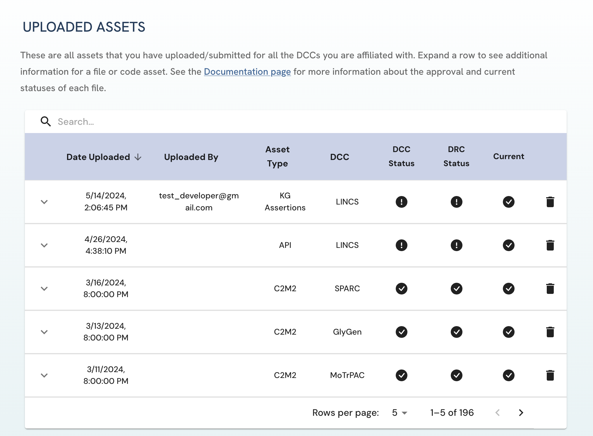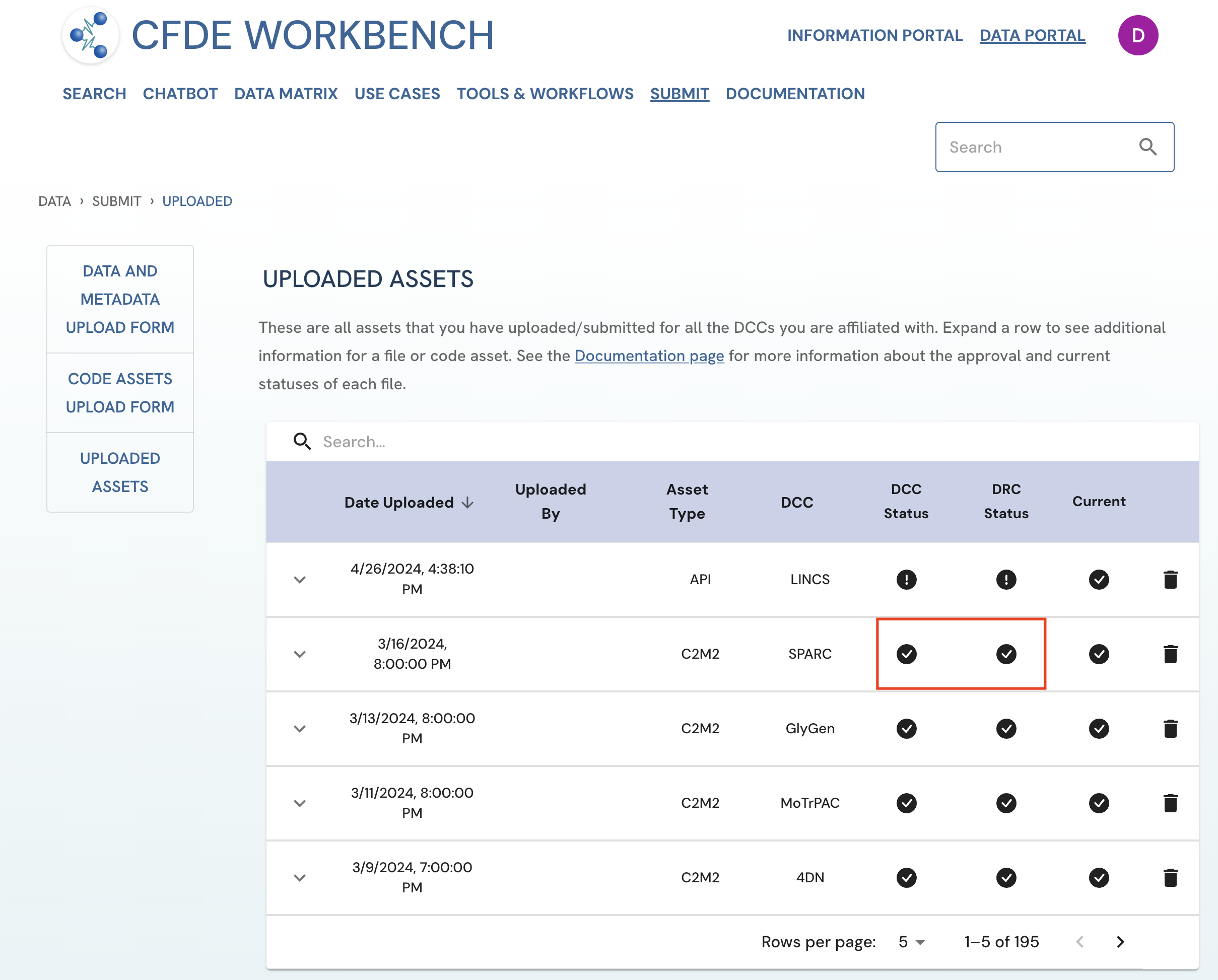 Figure 3: A screenshot of Uploaded Assets page showing a submitted asset with both DCC approval and DRC approval. View of Uploader User