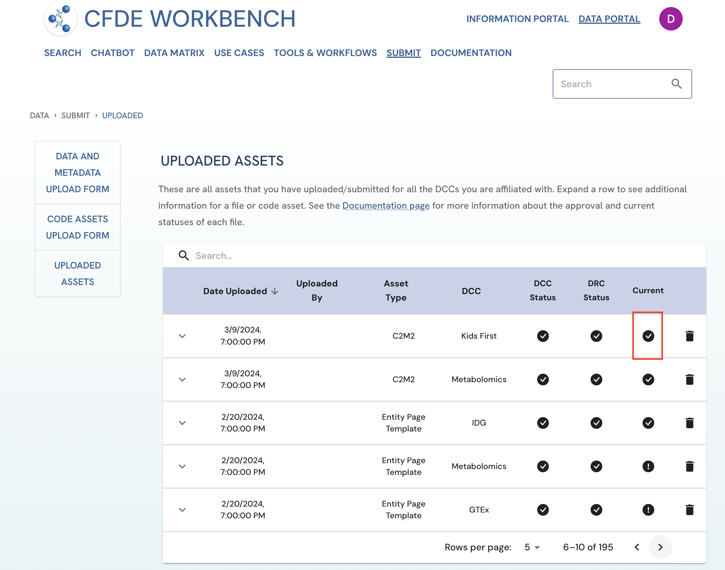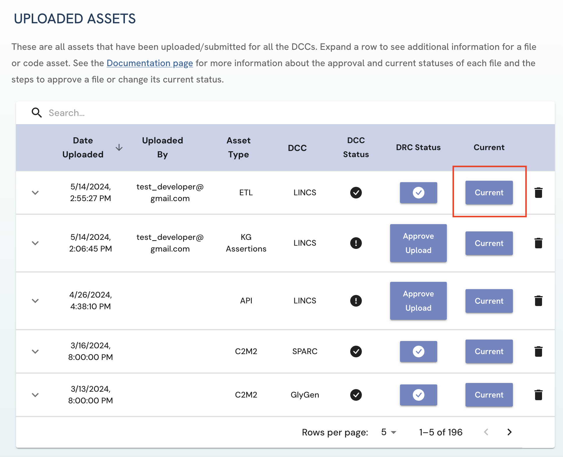 An asset tagged by the icon under the 'Current' column on the Uploaded Assets page is considered the current version of that file type for a given DCC.