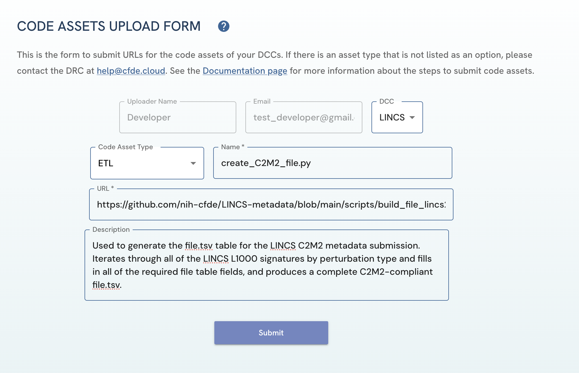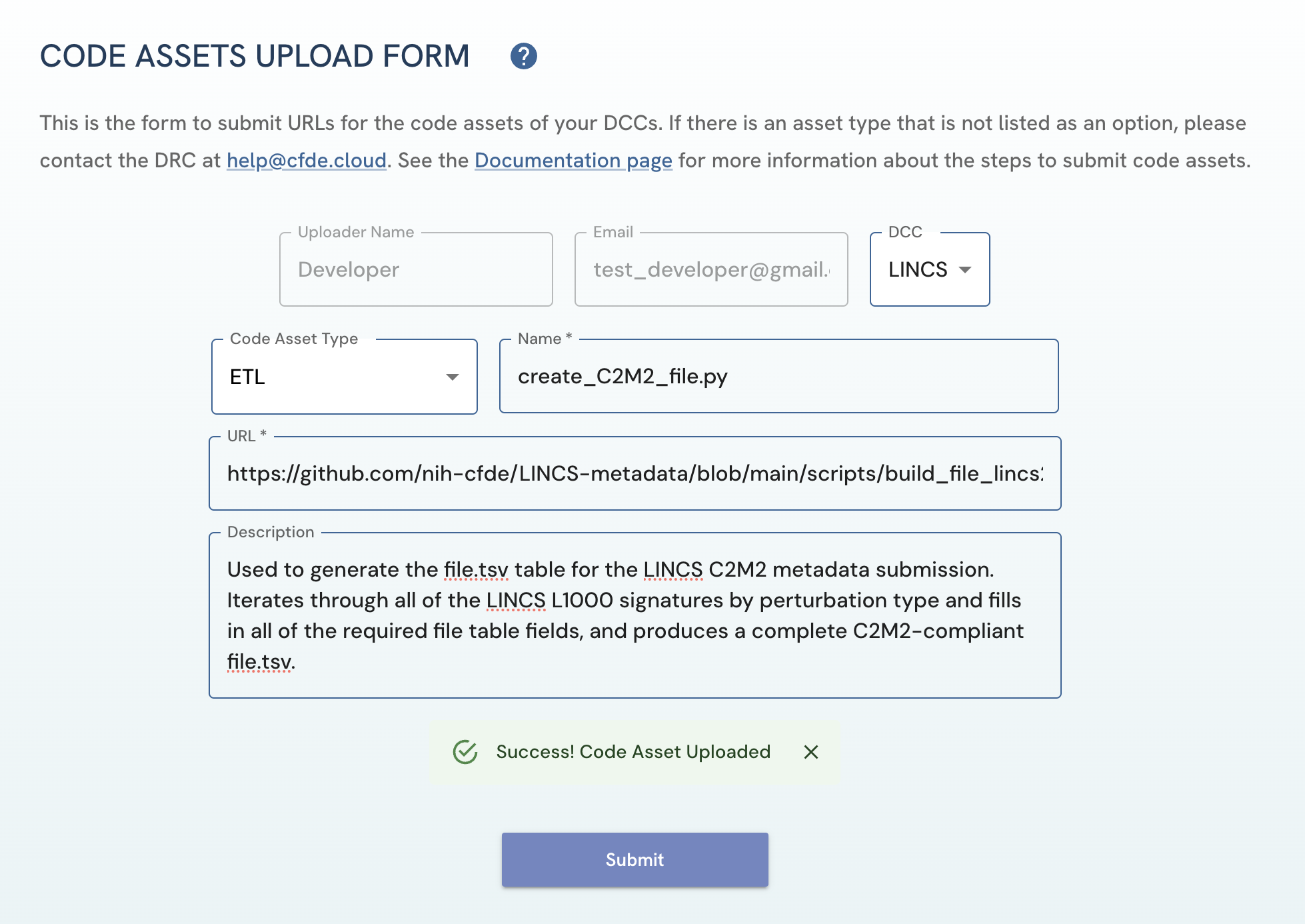 Figure 2: A screenshot of Code Assets Upload Form showing submission of code asset.After clicking on the “Submit Form” button: