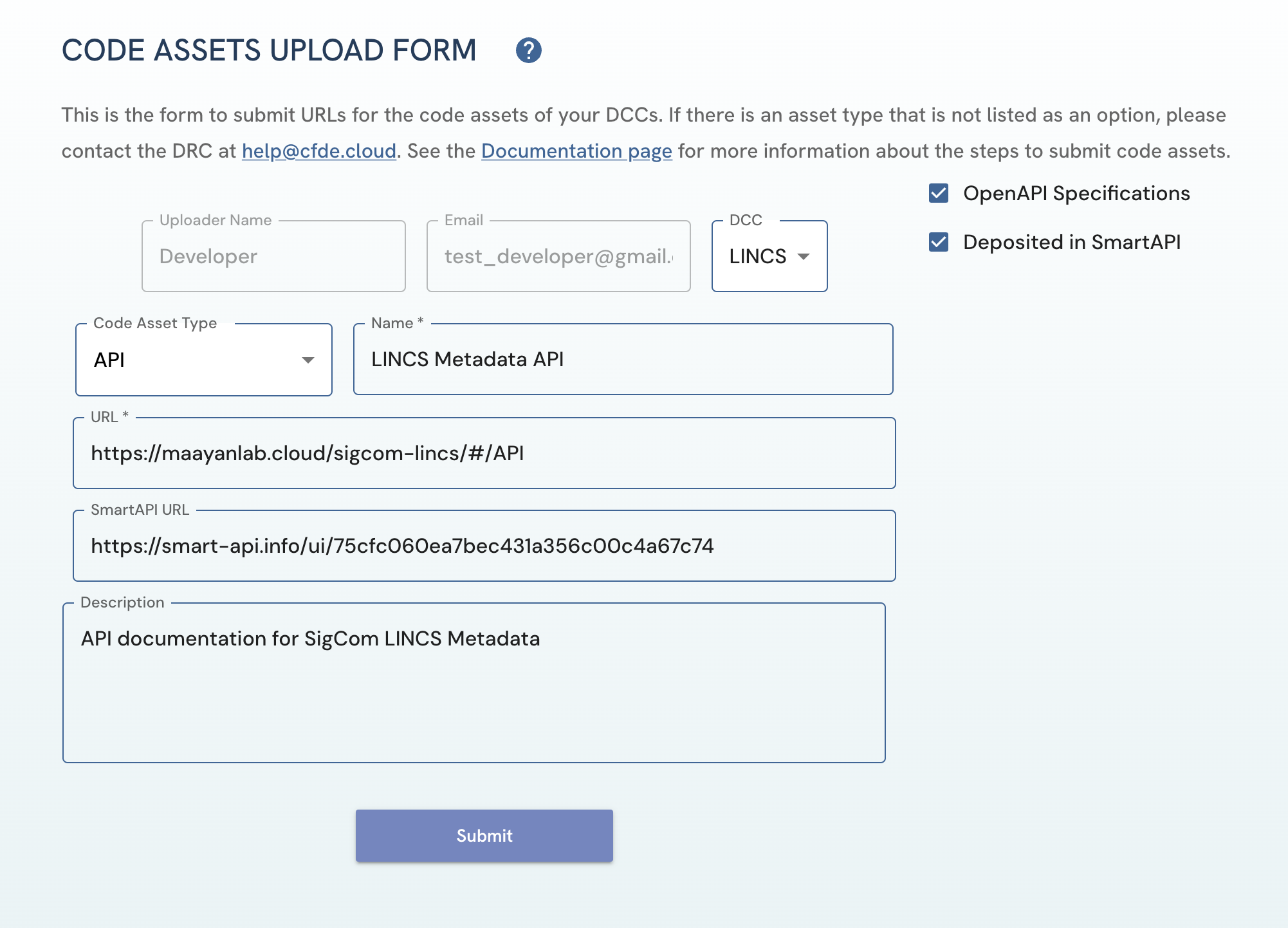 Figure 5: A screenshot of Code Assets Upload Form page showing submission of API code asset.Before uploading, ensure that all your account information has been entered/is accurate on the My Account page