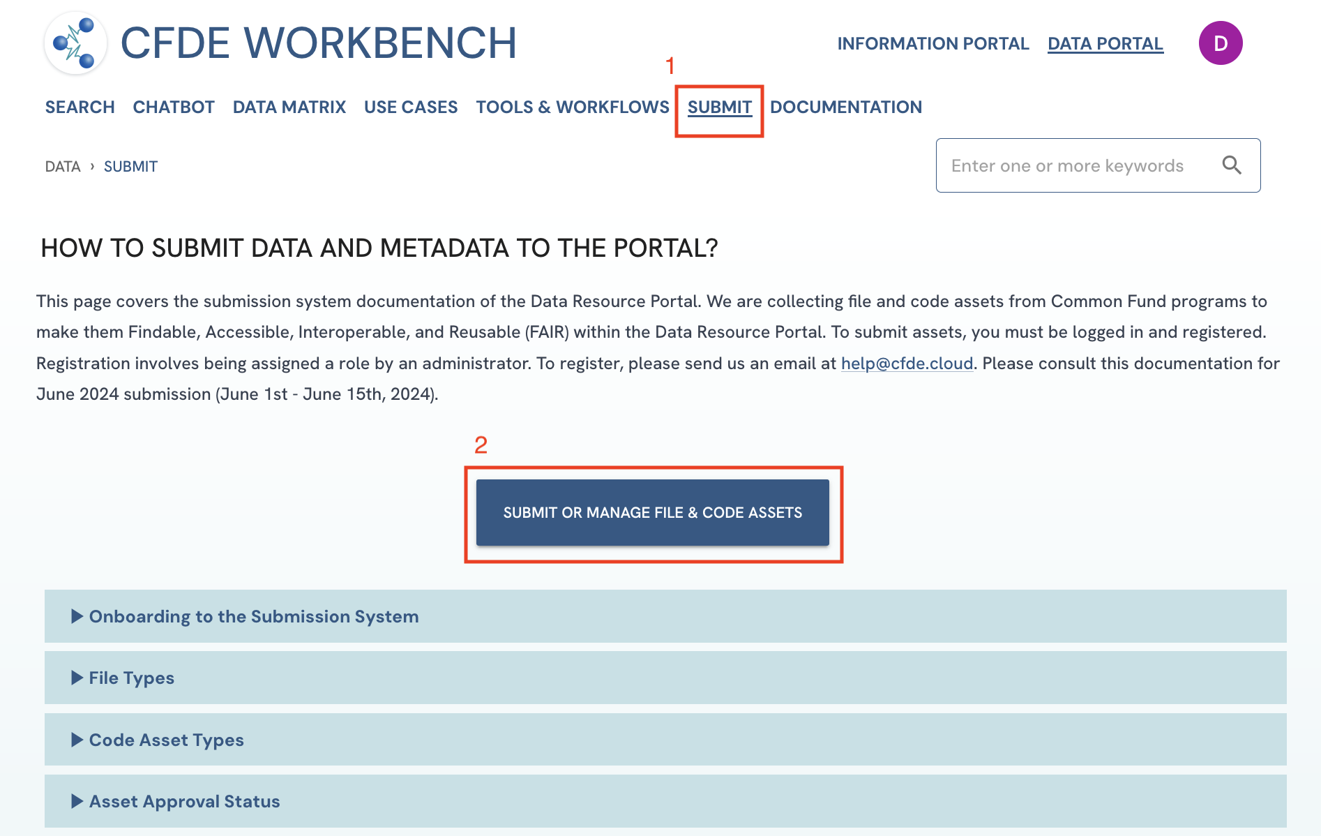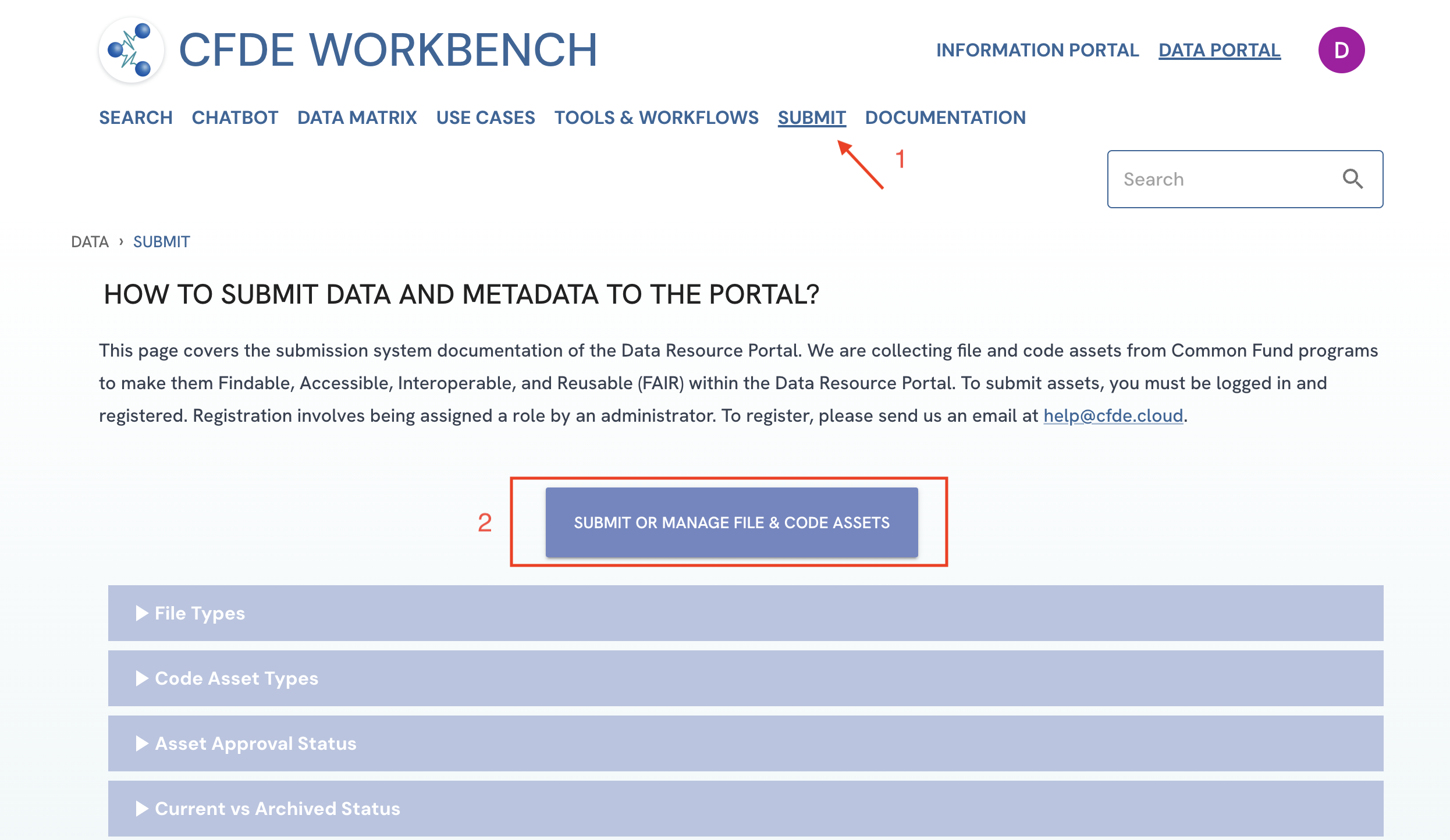 Figure 1: A screenshot of Data Portal showing navigation to Code Assets Upload Form.