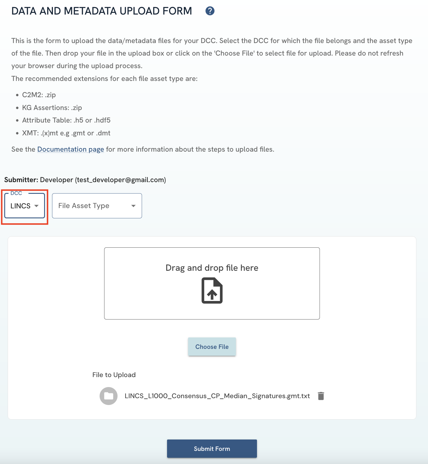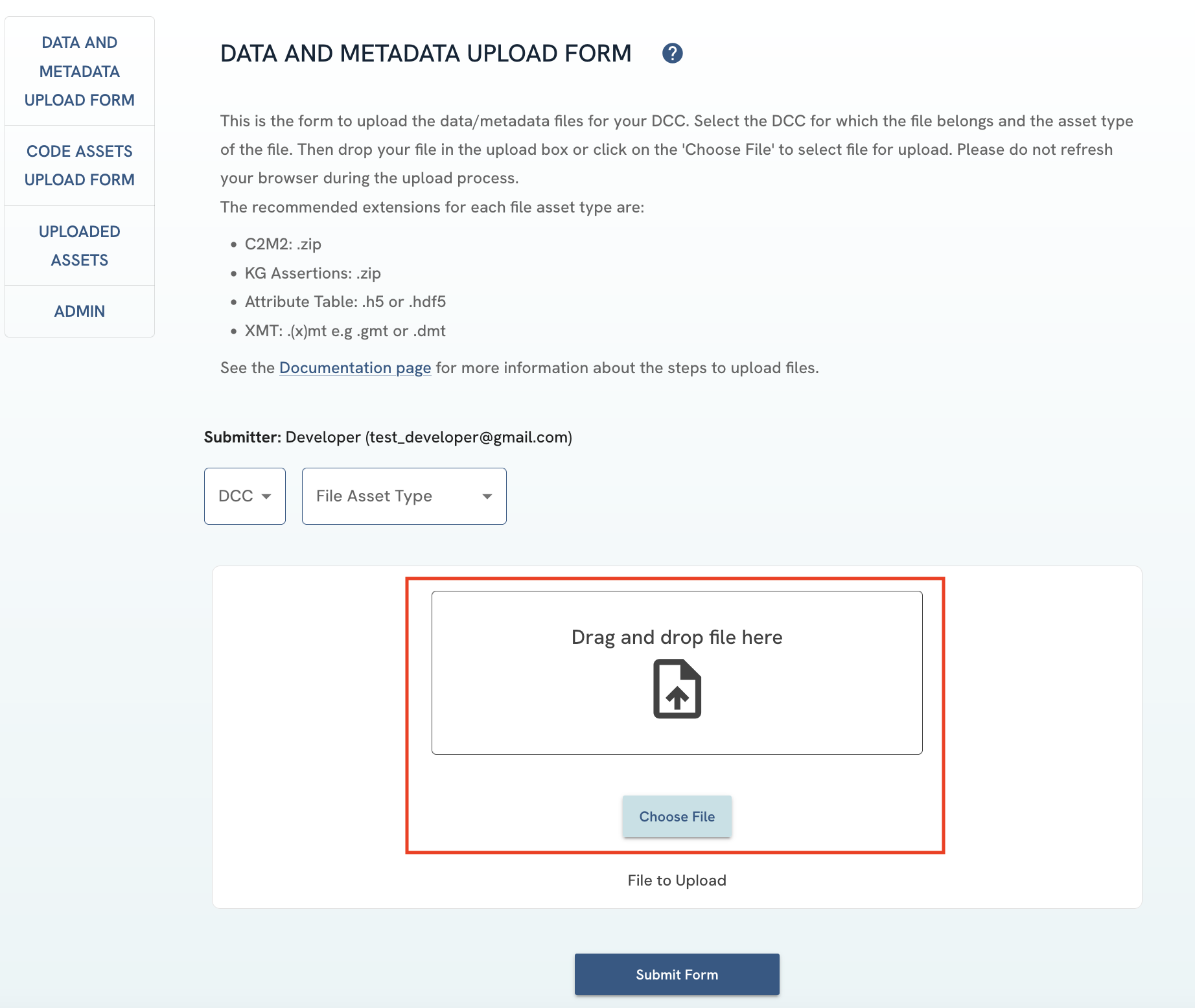 Figure 4: A screenshot of Data and Metadata Upload Form showing DCC selection.