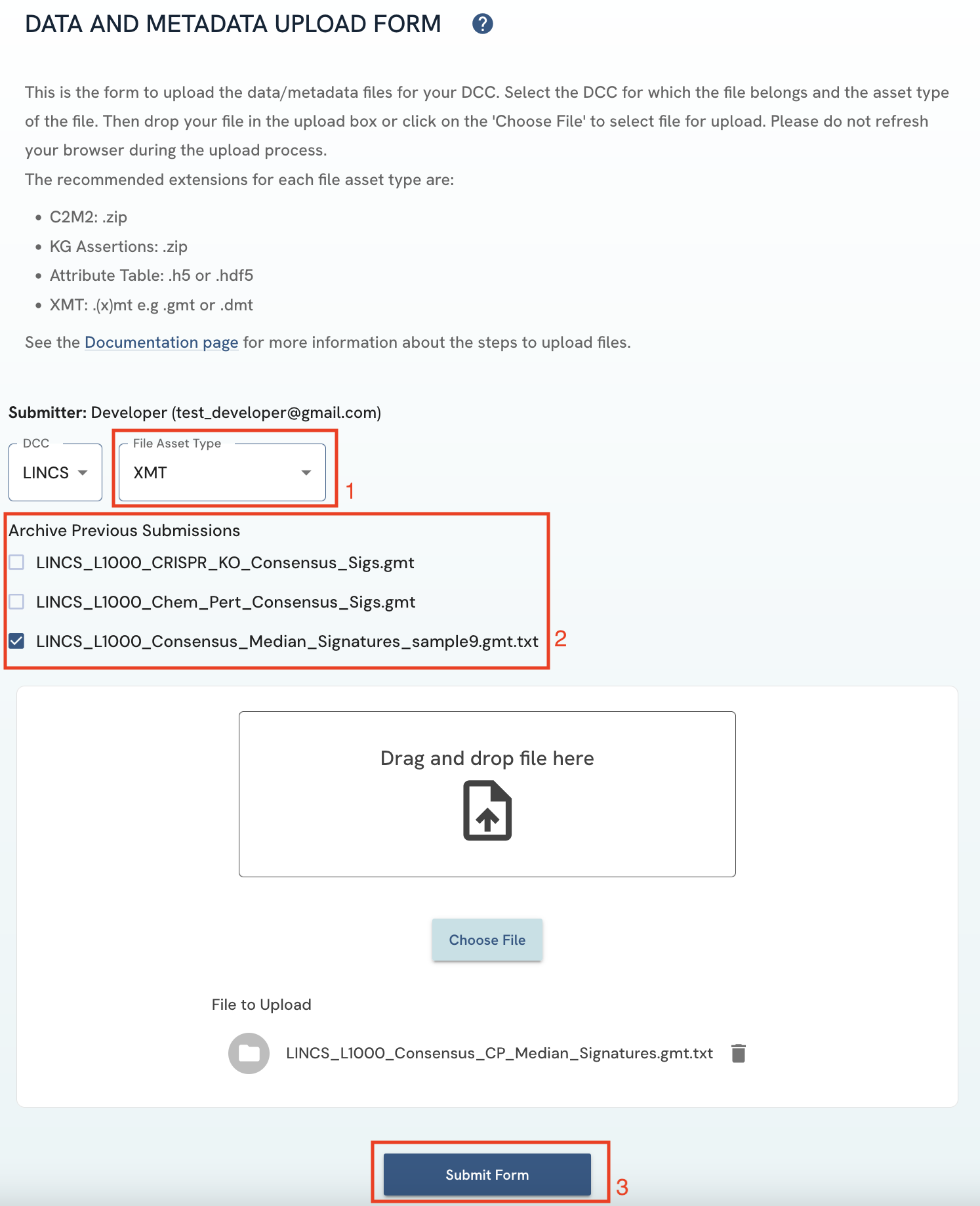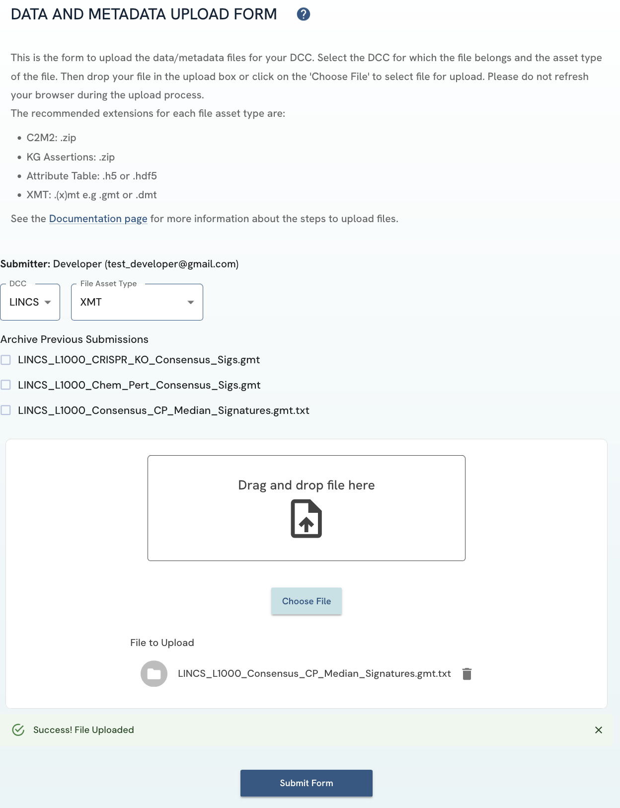 Select the file asset type of your submission. A list of previous submissions that are marked as current will then be displayed. If the submission you are doing is an update of an older one, click on the older file to archive it automatically (see previous section regarding current and archived status). Click on the "Submit Form" button to upload the file.