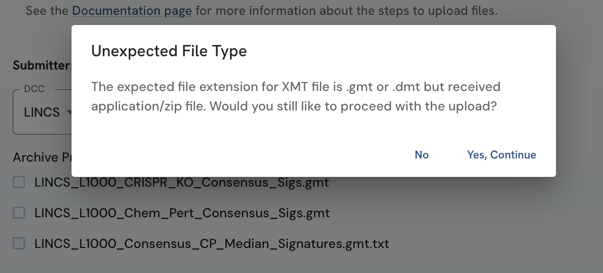 Unexpected File type: There are file extensions that are expected for each file asset type. If the extension of the selected file does not match one of the expected extensions based on the entered File Asset Type, a dialog box will appear requesting you to confirm your upload of this unexpected file type. If the unexpected file type is intentional, click on the 'Yes Continue' button to proceed with the upload, otherwise click 'No' to cancel the upload. The recommended extensions for each file asset type are: